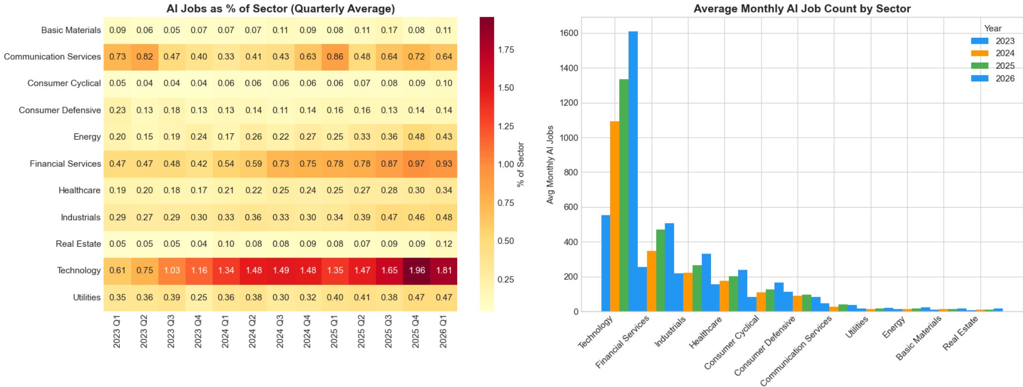 The sector data says otherwise. AI job postings are growing in 10 out of 11 sectors: