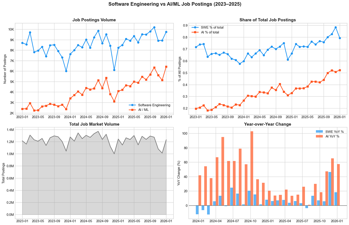 The full picture: SWE and AI absolute counts (top-left), share of total postings (top-right), total market volume (bottom-left), and year-over-year change (bottom-right). Now you have the tools to read these charts properly.