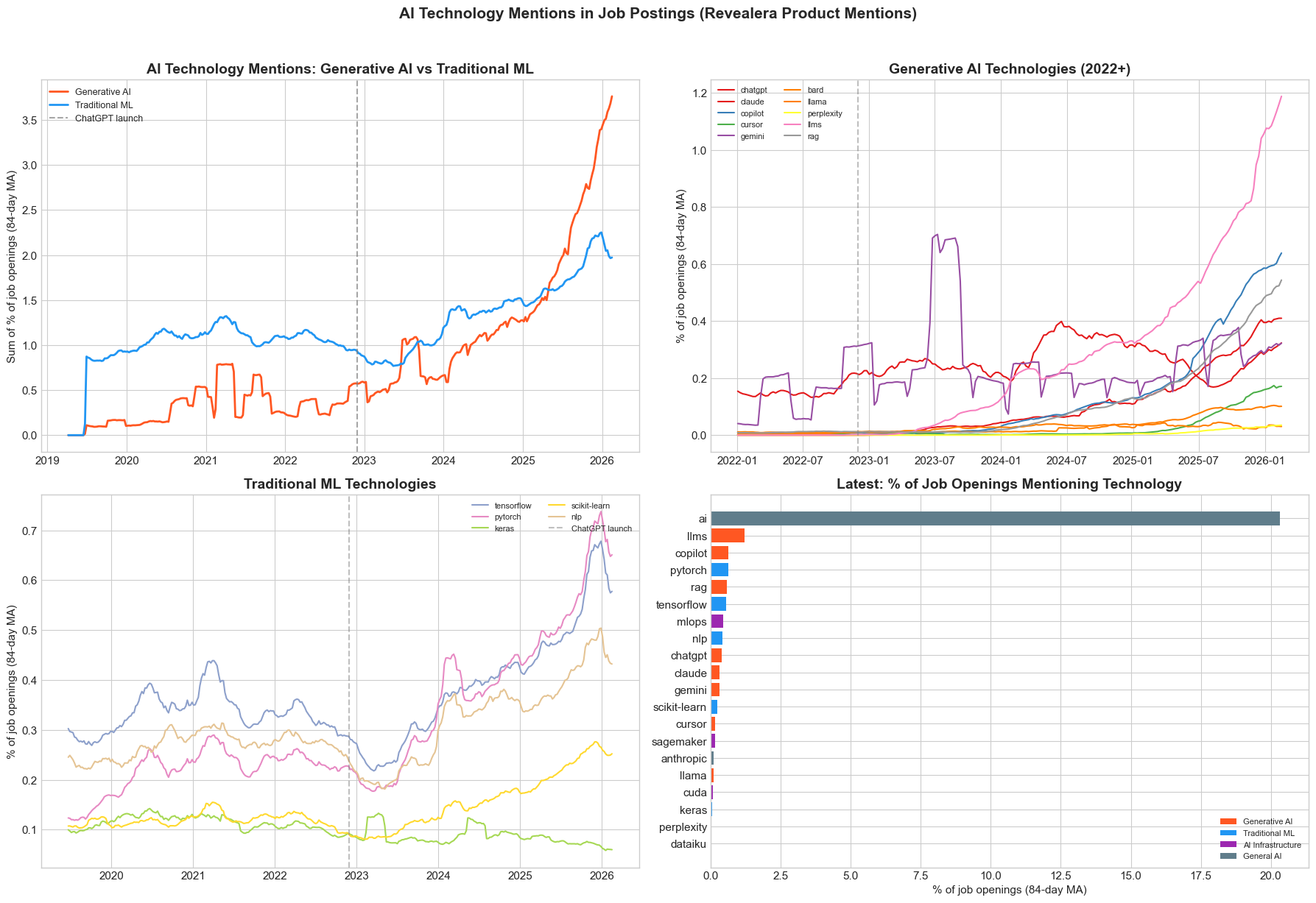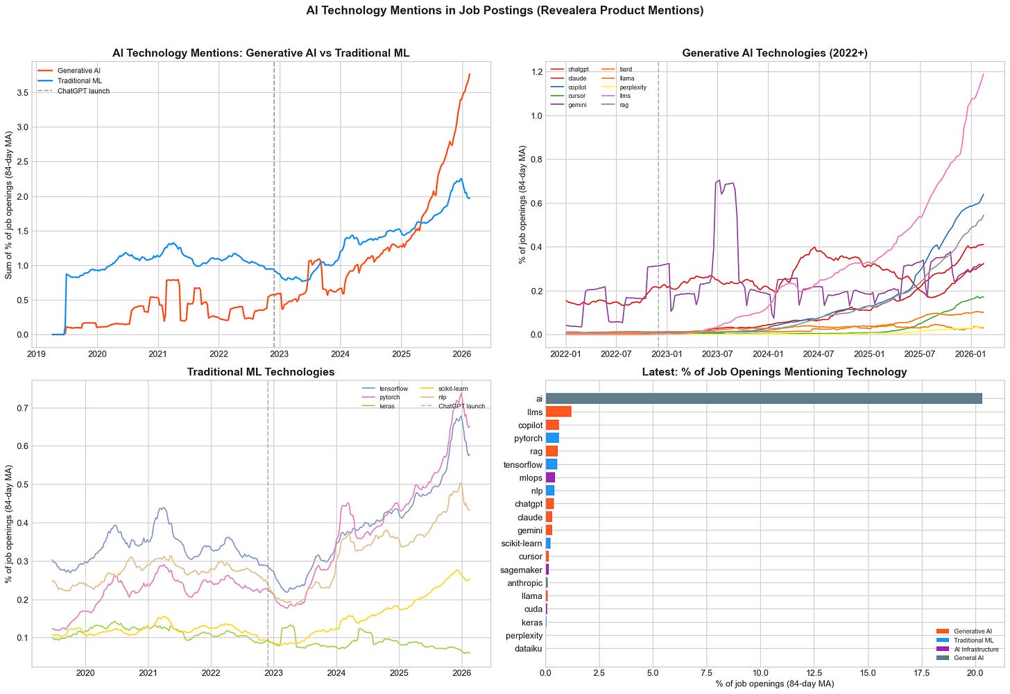 What specifically are employers hiring for? Using Revealera’s product mention tracking across 28 AI-related technologies, the picture is striking.
