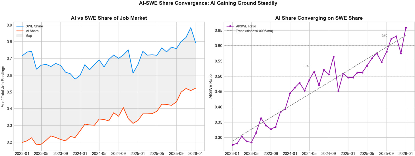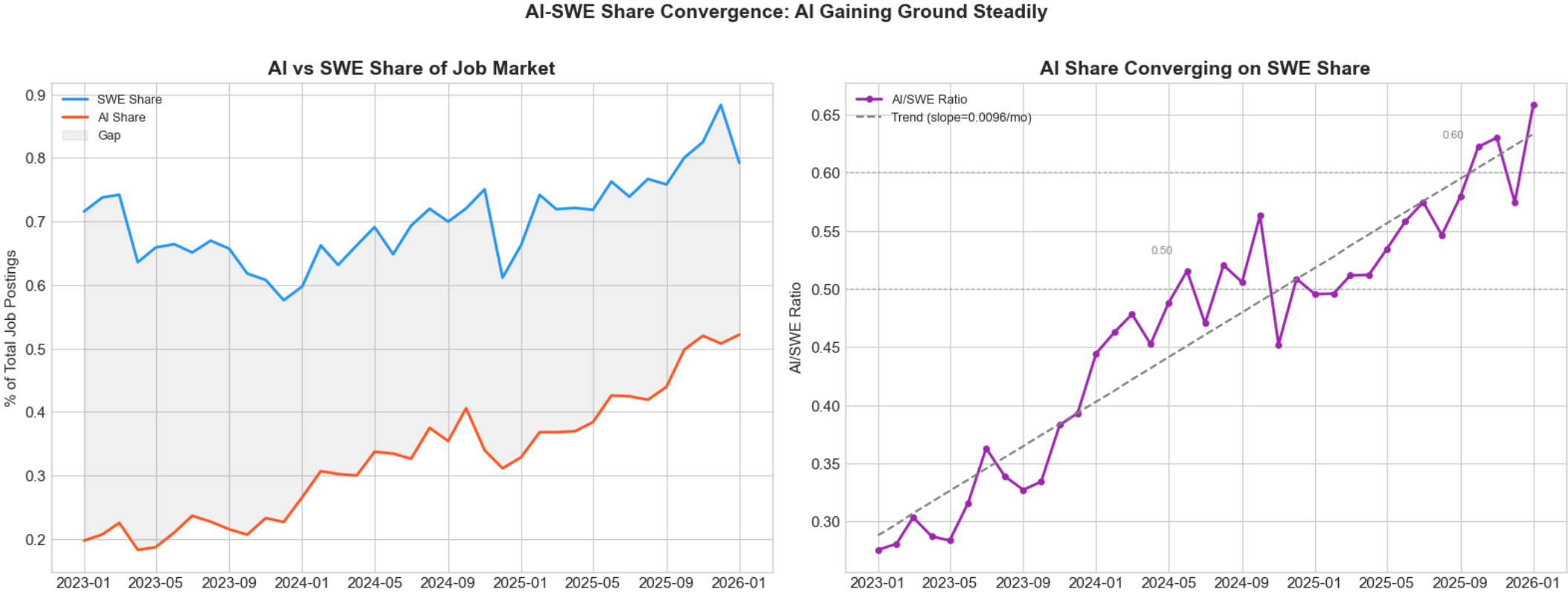 Left: AI and SWE share of total postings with converging gap shaded. Right: AI/SWE ratio climbing from 0.28 to 0.66 with OLS trend line.