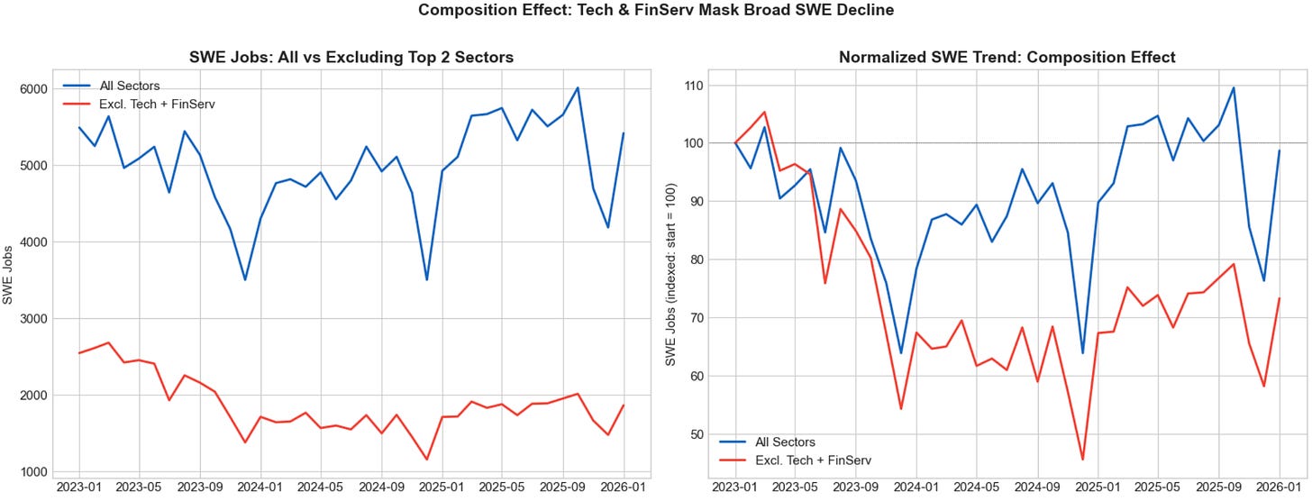 But Technology is up +64.9% and Financial Services is up +29.1%. Together, these two sectors accounted for 55% of all SWE postings in 2023 and grew to 66% by 2025. Their sheer volume drowns out the other nine sectors in any aggregate measure.