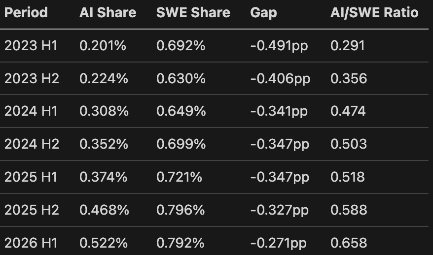 The real signal isn’t SWE decline or SWE growth. It’s AI-SWE convergence. And it’s accelerating.