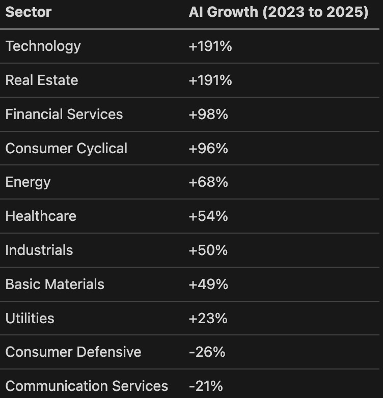 The growth is broad. Healthcare (+54%), Industrials (+50%), and Energy (+68%) are all adding AI roles at substantial rates. Real Estate — a sector where you might not expect heavy AI adoption — matches Technology’s +191% growth rate (albeit from a smaller base). Only Consumer Defensive and Communications are contracting.